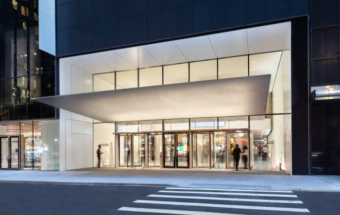 The 53rd Street entrance canopy is a thin 42’ plane weighing 95,500 pounds, which appears to slice through the glass facade and float above the main entrance doors. The canopy is comprised of steel plates and concealed ribs, suspended on steel rods. The canopy cantilevers 26’ beyond the facade of the building, out to the sidewalk to mark the main entry point for visitors.