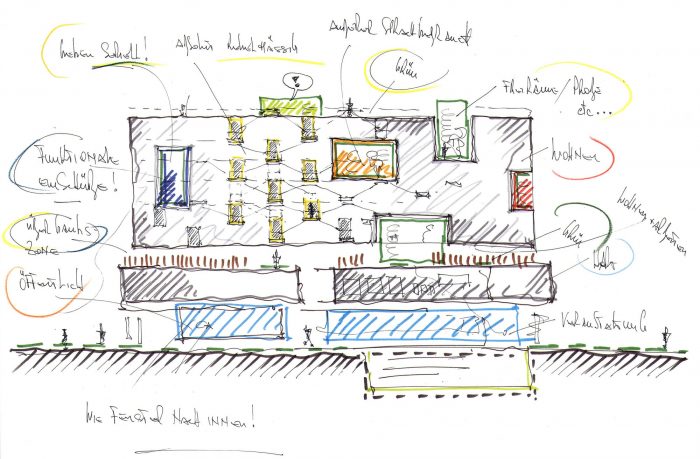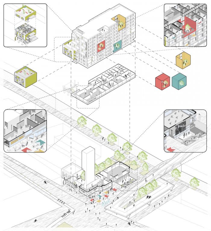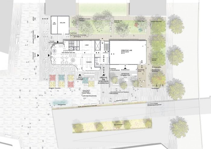In addition to the apartments, with generously integrated open spaces that can be reached from every floor, the publicly oriented first-floor zone offers services, information, and a concierge, as well as a cafeteria with a guest garden and an adjoining Creative lab / Event space. The consumption-free, partly stepped zones with participation potential for open-air theatre, summer cinema, readings or concerts offer synergies in the open space and form a flowing transition to the public realm with the surrounding squares and lounge areas. The soundproofed basement allows for a variety of uses: In particular, rehearsal rooms of various sizes, and dance and movement areas.