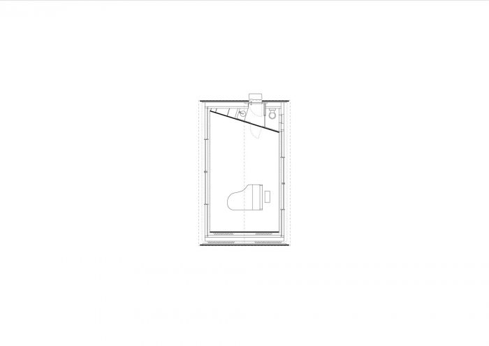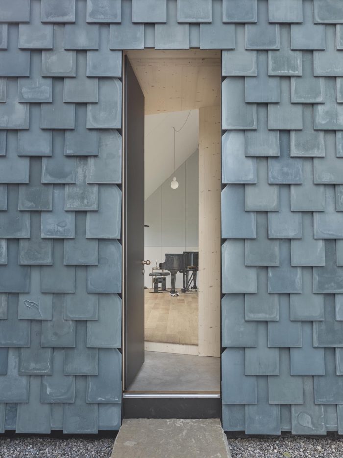 一个带有入口、厕所和储藏空间的服务室层,隐藏在朝向庭院的坡屋顶外墙的厚度中。这使得音乐馆可以独立于住宅楼使用。在这个中间层,外壳的材料被暴露出来:混凝土底座和交叉层压木板的新鲜松木变得可见。