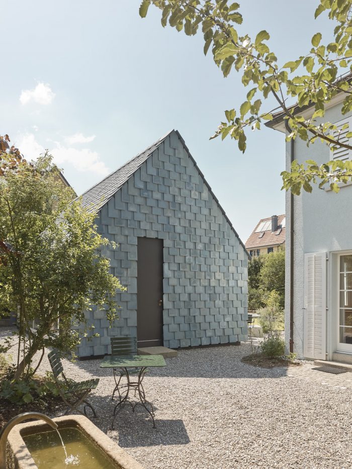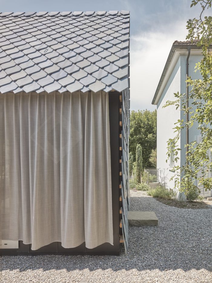 A pianist asked us to imagine a space entirely dedicated to music, where she can practice and teach: a quiet and magical space as an integral part of her beautiful garden in the Swiss town of Winterthur. The single-story music pavilion stands on a simple concrete base. Both, the walls and the pitched roof, are constructed with 12cm thick cross-laminated timber panels – almost like a cardboard model. The steep gable roof rests on both ends of the walls and floats along the eaves in order to completely open the room towards the garden.