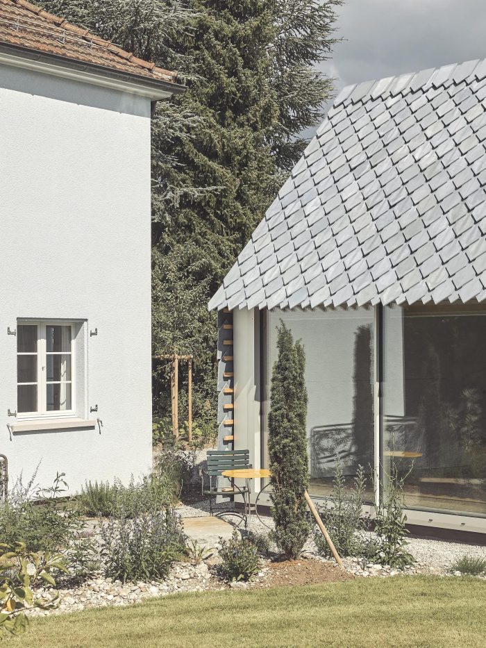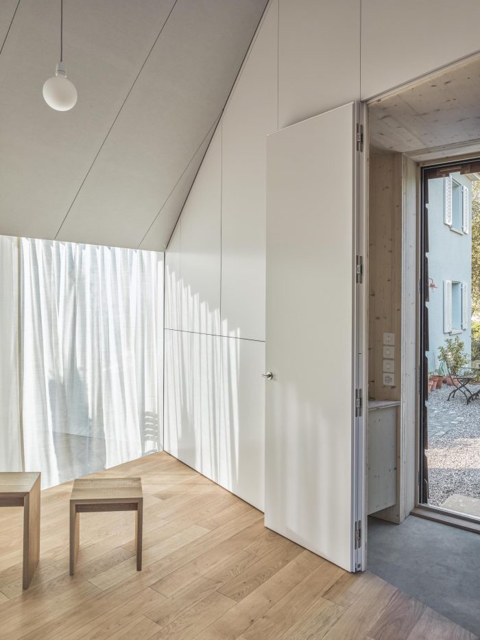 A service room layer, with an entrance, a toilet, and storage space, is hidden in the thickness of the gabled facade towards the courtyard. This allows the music pavilion to be used independently of the residential building. In this intermediate layer, the materials of the shell are exposed: the concrete base and the fresh pinewood of the cross-laminated timber panels become visible.