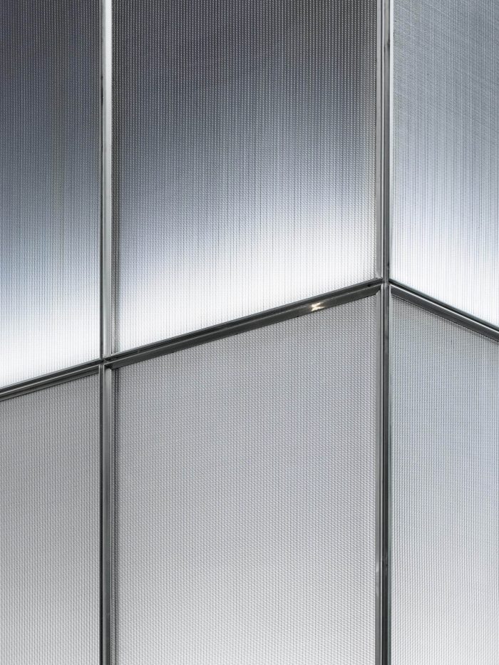 首先,材料的变化从粗糙的触感到光亮的金属,体现了每层楼的过去、现在和未来的时间变化的遗迹。第二,用大块和小块的重叠和分割结构显示了时间的分散性,并通过楼梯的结构形状抽象地表达了时间之间的联系。