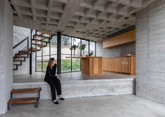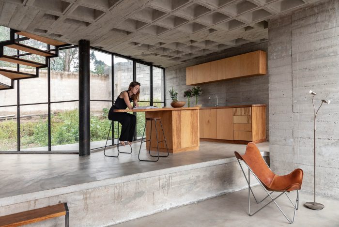 The house is resolved in two moments, with different materialities. The first articulates walls and reinforced concrete slabs, which material continuity envelops the interior spatiality, and adapts to the suburban city environment on its exteriors. The left exposed concrete, the polished floor, and the formwork walls and waffle ceiling, create different textures.