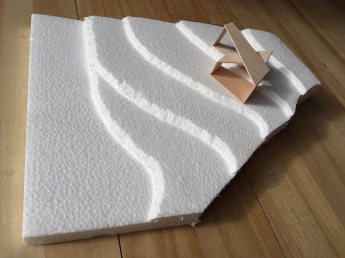 最初,房子有80平方米的室内面积,和40平方米的露台,后来被扩大。15平方米在上层(朝向露台),20平方米在一个独立的模块。