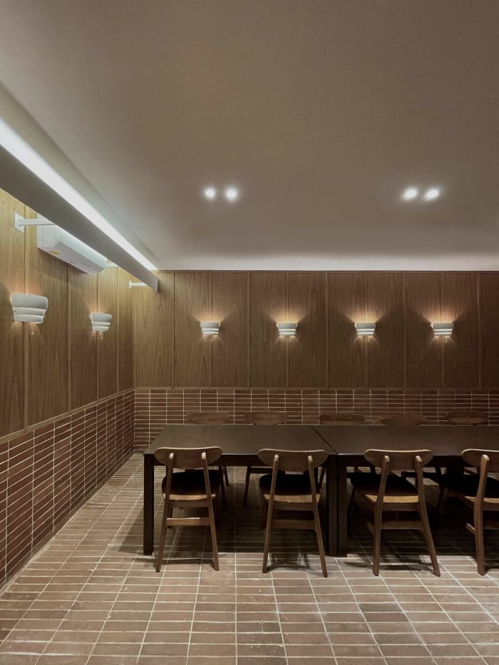 解释 “重建的破坏",在每个部分用不同的处理方法来探索砖的材料。为了在户外用餐区周围创造一个焦点,根据万隆的用户习惯,将解构的裸露砖块排列的想法融合在一起--形成一个符合人体工程学的角度曲线,为用户创造一个舒适的体验,让他们在白天和夜晚都能躺下,放松和享受天气。另一种不同的处理方法被应用于主楼的内部区域。探索开始于为赤土砖的主导颜色寻找一个互补的颜色。结果出现了亚马逊绿色,以加强建筑外墙的流行色,因为用户是以年轻人为主的。在寻找酒吧所在的主楼的最佳地板处理方法时,发现现有的复古瓷砖,结果被新瓷砖覆盖。为了保护这些稀有材料,新的瓷砖被拆除,以增强稀有复古瓷砖的美感。