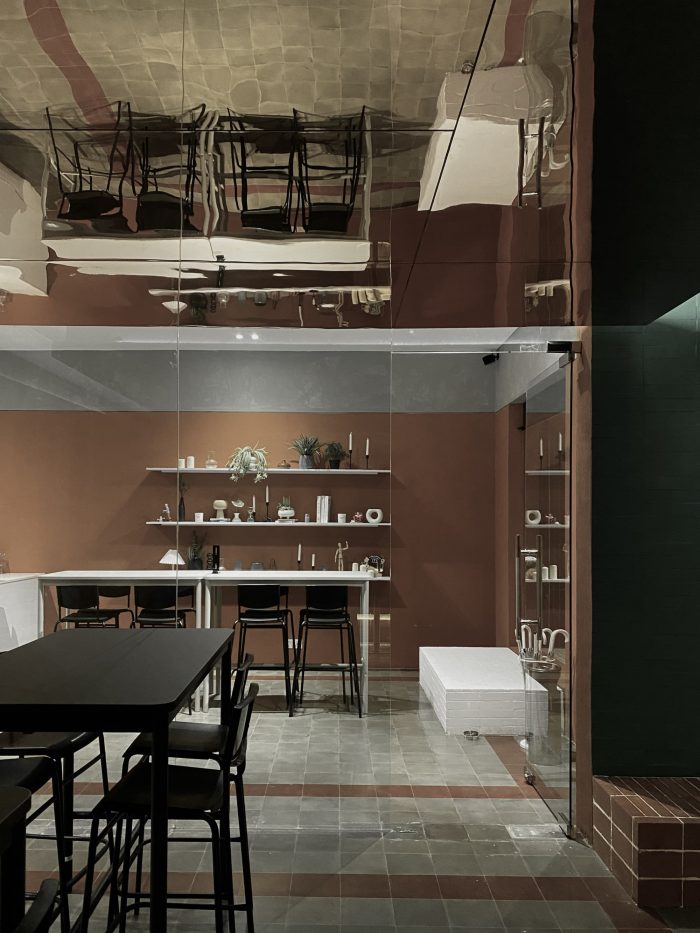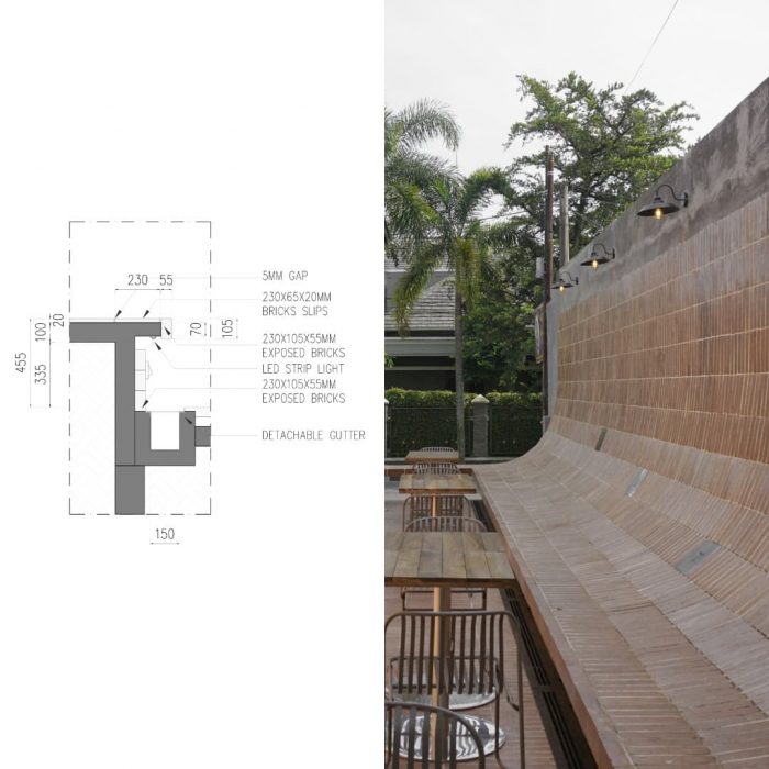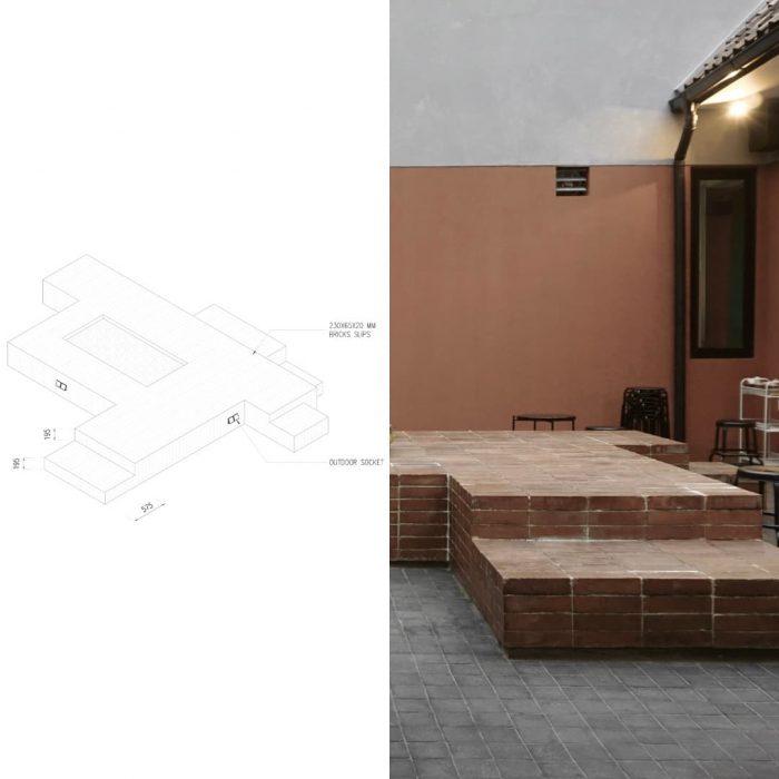 Interpreting ‘reconstructed the destructed’, exploration in brick materials was approached with different treatments in each section. To create a focal point around the outdoor dining area, the ideas of deconstructed exposed bricks arrangement were merged based upon user habits in Bandung - forming an ergonomic-angled curve to create a comfortable experience for users to lie down, relax and enjoy the weather during daytime and day night. Another different treatment was applied to the interior area of the main building. Exploration started by finding a complementary color to the domination of terracotta brick color. The result came up in amazon green color to enhance the pop color in the building facade, as users are dominated by the youth. In finding the best flooring treatment in the main building where the bar is located, existing vintage ceramic tiles were found, which turned out to be overwritten by new tiles. To preserve these rare materials, new ceramic tiles are dismantled to enhance the beauty of the rare vintage ceramic tiles.