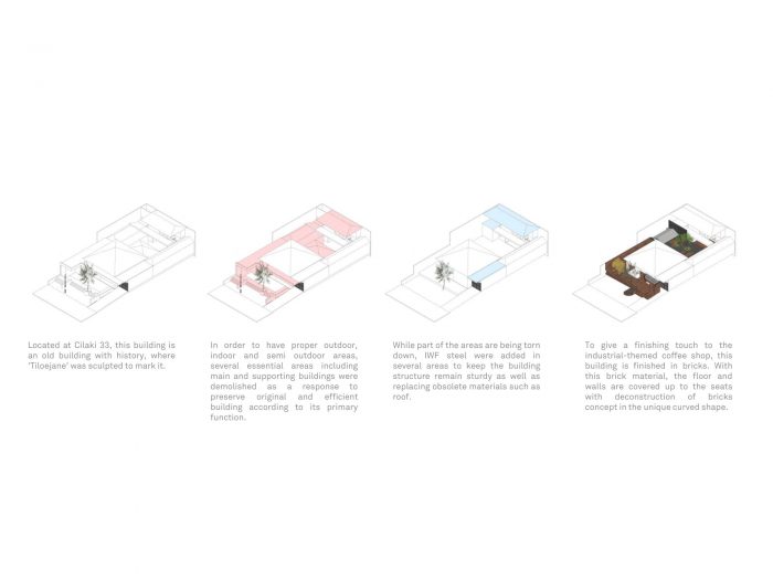 The site comes with several building masses, where the original building was formed by a 30 cm-thick wall without any supporting column or beam from reinforced concrete. The other building masses spread organically topping one another due to different activities required by different owners, creating disorganized layout functions, and leaving many site problems ranging from structural to maintenance issues. The beauty of the original building remains unseen due to disarranged layers of additional buildings. Thus, the finding has led to a decision to demolish ineffective additional parts from the main existing building, restoring the original building while exposing deconstructed bricks as the narrative point of ‘Tiloejane’ story, as seen on the left side of the building with its slanted fort walls made of bricks, reconstructing the destructed. The demolition aimed to reopen closed spaces, by specifically injecting some exposed H-beam to alter the quality of the existing space due to a more spacious indoor area. These astonishing findings require impeccable and quick treatment during the construction process.