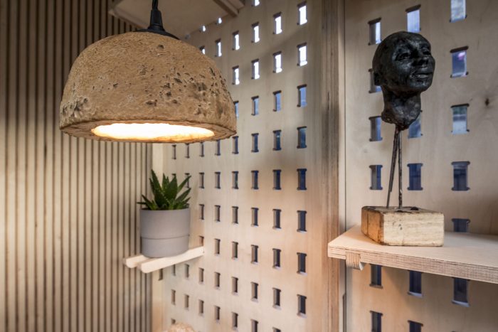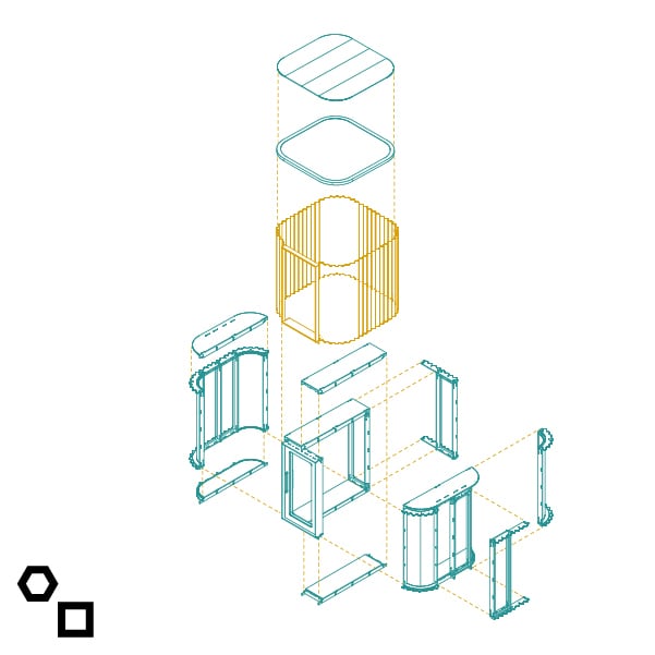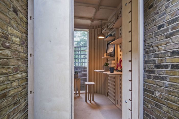 Structure & finishes The project seeks to find a balance between low-cost and cozy design. The structure is made of digitally fabricated birch plywood modules, that can be customized according to each space and user’s need. Starting from a minimum of 1.8x2.4m at £5K, the home office pods can grow infinitely, by just adding more modules. All modules come at a fixed height of 2.5m which is the max height that doesn’t require planning permission.