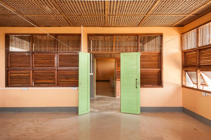 Inspired by local building methods. While travelling around the country, the architects had studied the traditional construction methods. As with the high school in Thazin, they designed the hospital according to the country’s typical “brick nogging structure”, using a skeleton construction with brick infill. In the case of the hospital, the supporting skeleton was made of reinforced concrete to achieve greater stability and to protect against insect infestation. Architecturally striking features are the movable shading and rain protection elements made of wooden slats and the roof construction of the atrium house with its all-round gable top. In combination, both also ensure constant ventilation — one of the major issues when building in a tropical climate. The underside of the ceiling structure made of timber trusses was largely covered with weaved bamboo mats. In this way, the air flow circulates through the open windows behind the shading folding shutters, upwards through the bamboo lattice and back out again via ventilation louvres in the ridge of the gable top. “There is a pleasant draught everywhere in the building,” says Julia Raff, the project architect, explaining the simple but effective basic principle of cross-ventilation. Since there are no construction companies in the area, the building was largely erected by villagers under the guidance of a carpenter.