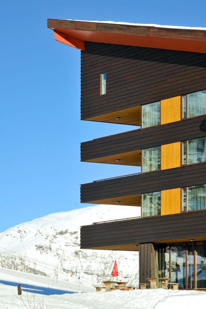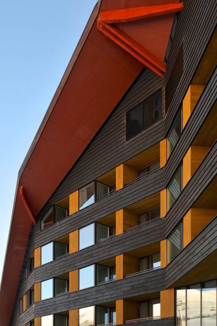 The shape of the building is inspired by the traditional alpine chalets in southern Europe and American mountain lodges, while the roof and plan is sculptured to adapt to the scale of the existing buildings on site and the surrounding landscape. The hotel is cladded in wide laminated horizontal wood planks and which makes the large building appear smaller.