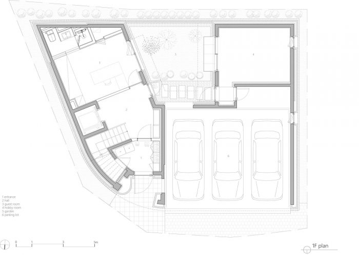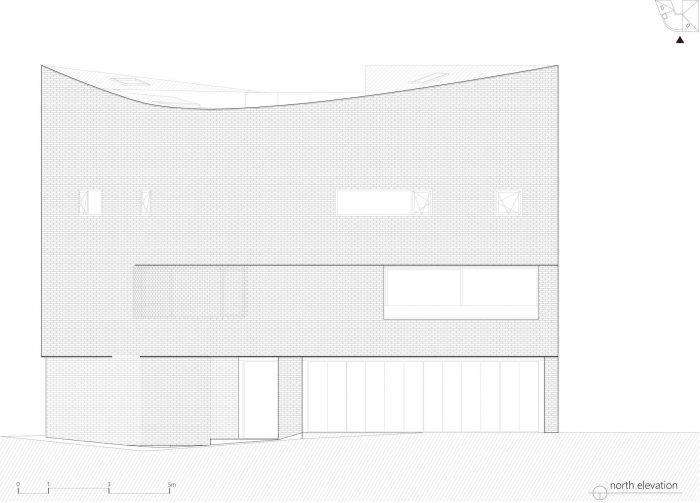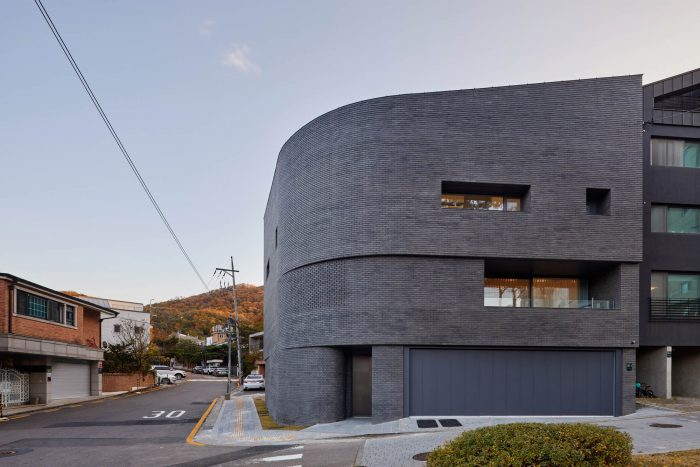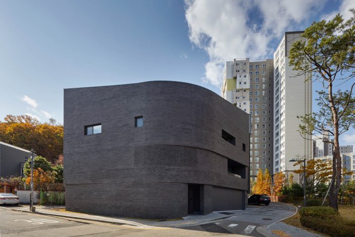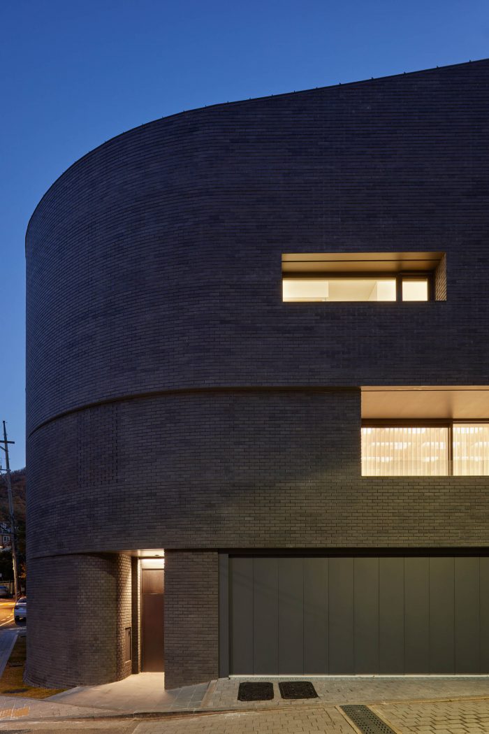 A yard of a single-family house has the most direct contact with the outside. In this project, the yard is located in the site’s center, making the house the least interfered from the outside and surrounded by the inner space. Therefore, the interior of the house and the exterior of the city are separated. The city’s north side is closed with achromatic black bricks, thereby adding another background to the town. The simple massed of form and finish are horizontally segmented along with the flow of surrounding buildings not to give any visual disconnection in the city.