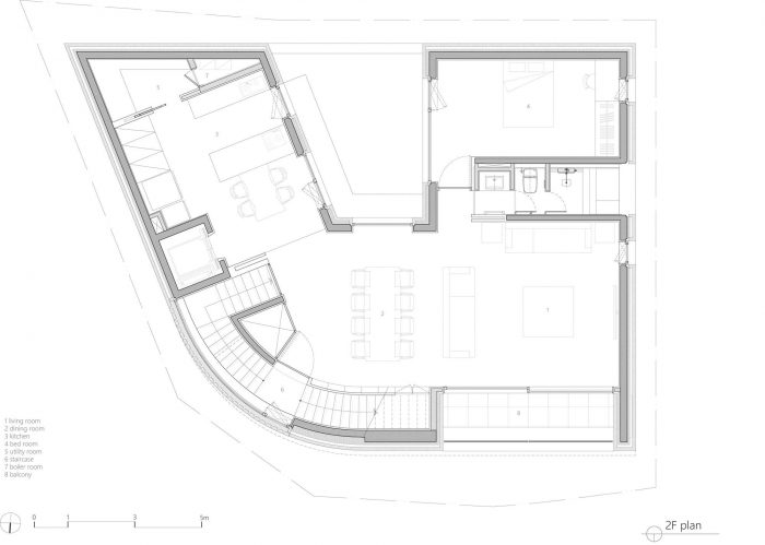 一组包含行动的空间--N屋的家庭希望建造 "最后的房子",以度过大量的时间并分享他们的生活。家庭活动与在家的时间成比例增加。在现有的房子里,划分为必要功能的空间布局,如客厅、卧室和厨房,被细分为所有家庭成员使用的功能空间和考虑每个成员品味的行动导向空间。即使在房子的内部,即私人区域,空间的特征也涵盖了从最公共的客人空间到考虑每个家庭成员品味的地方。