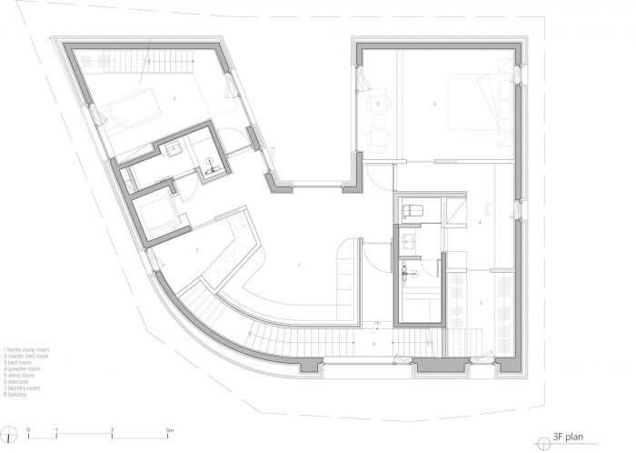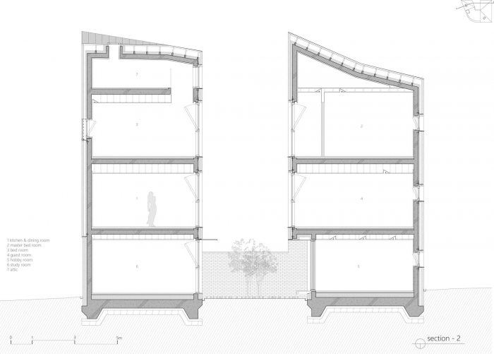 Since action-oriented space planning has no advantage in the usability of each space, physical environment such as lighting and ventilation should be provided uniformly. So all private activities are arranged vertically around the courtyard to get proper light and wind through spaces. The large window on the south side serves as a device for lighting and a medium connecting space and another space of an urban vertical single-family house that should be separated vertically.