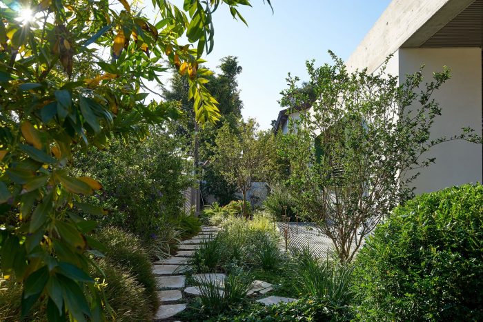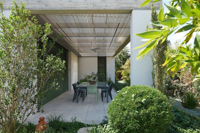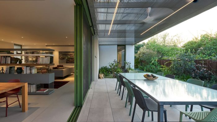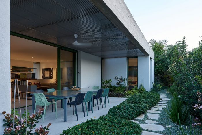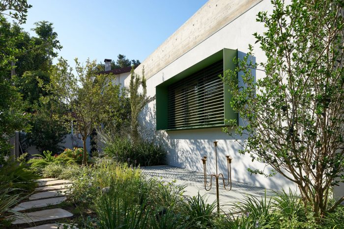Exposed concrete is a dominant material as it was the owners’ dream to have, and green color serves as a contrasting color.