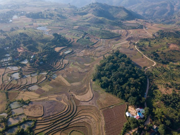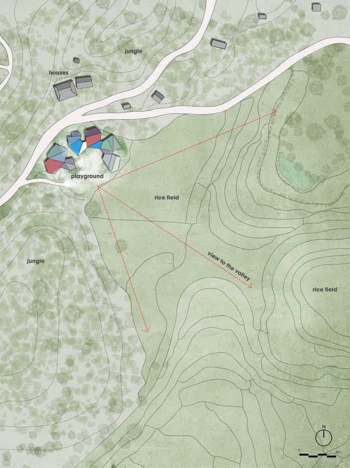 Na Khoang学校位于一个泰国民族的村庄中间--那里有丰富多样的文化生活和社区活动。灵感来自于山与山之间的花朵设计,每个屋顶都有不同的倾斜度,就像一个多样化的、有节奏的舞蹈。