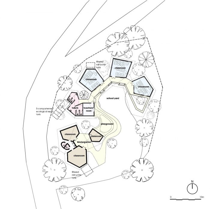The wall is built of several materials: unburnt terracotta bricks made on the spot from foundation soil, locally available degraded soil, and the pebbles collected by the people together and brought back from the stream. The construction process makes efficient use of wasteland, is environmentally friendly, and reduces construction costs.