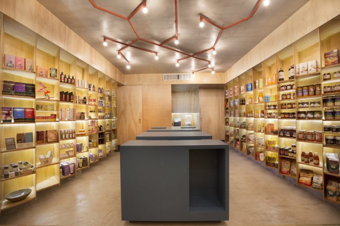 In the center of the emporium, lies a multifunctional structure to accommodate the shopping baskets, up to six people in the chai-café table, plus spaces for products and equipments. The arrangement allows the fluid movement of the visitors.