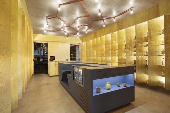 The project adopts a strategy that combines exposure and concealment of the products. A fixed grid oblique in relation to the two side walls permits full vision of the products for the incoming people, and in view of its concealment inside out. This feature guarantees a certain tranquility and silence, making the space more enjoyable for those who want to have a tea in the center table, without losing the typical plural ambience of the emporiums.