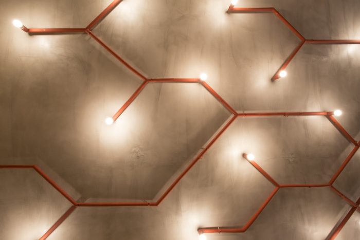 一个简单的LED系统突出了墙壁,有助于产品的可视化。一般的照明是由一个带有灯泡的金属管提供的,强度可控。