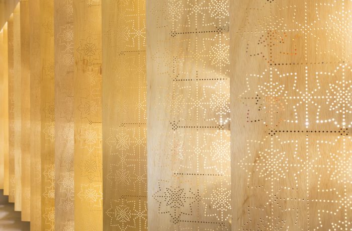 The standards used in the drilling of the pannels were extracted from Nanak Emporium’s logo, which is in turn referenced in the iconography present at the Golden Temple in Amritsar, a shrine of Sikhism, which is the religion of the owners of the emporium.