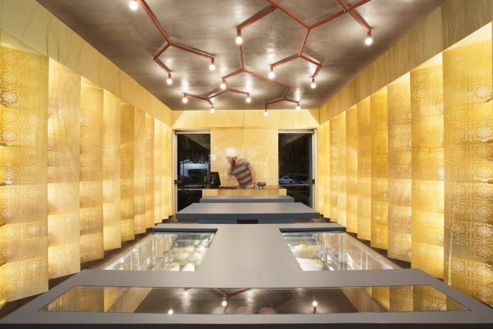 Raw materials are prioritized: concrete floor and ceiling and wood paneling on shelves, doors and walls. The yellowish wood takes on a golden glow, and acts as a background common to all products.