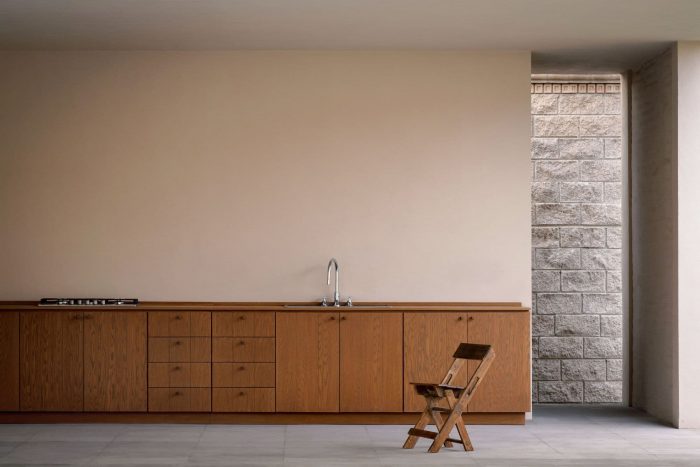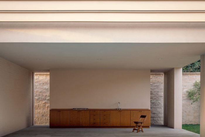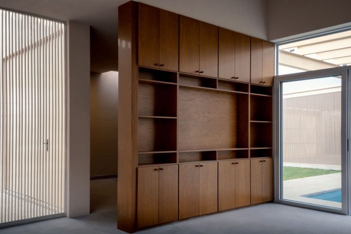 The day area opens at a height and a half that embraces the living room and dining room, revealing the existing visual and physical connection with the pool. In turn, this area becomes a meeting point between the kitchen, the breakfast patio, and the night area. The latter is found behind a subtle access embedded in a wooden dividing wall, which helps to scale the height of the rooms and the bathroom they share.