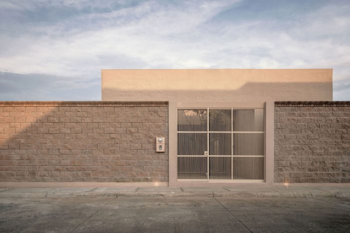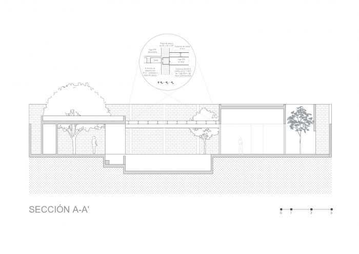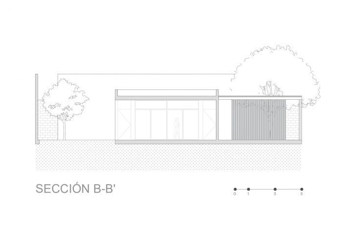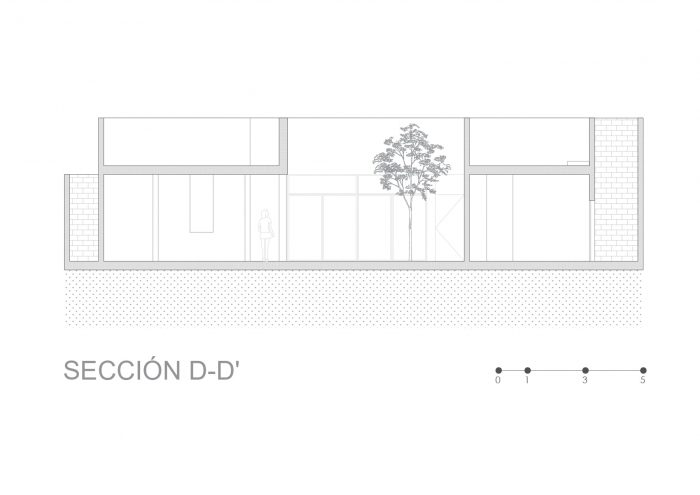 The façade is made up of a wall that contains the pedestrian and vehicular entrance, these being the only openings that, separately, coexist with the exterior, creating a sensation of hermeticity. However, once entering, the sectioned volumes begin to be revealed.