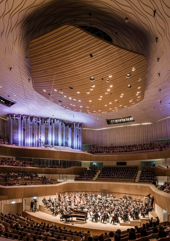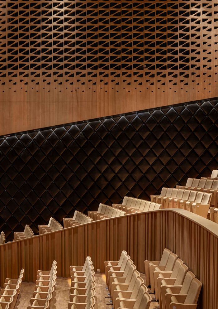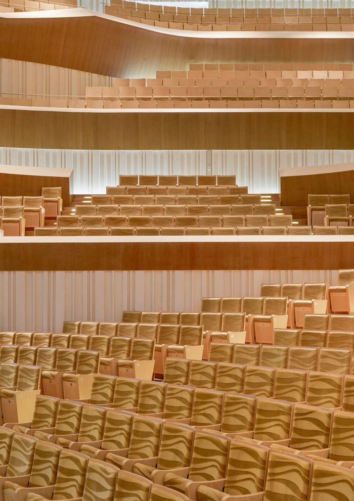 大厅的墙壁衬有橡木。公众从一楼进入,螺旋式坡道将他们带到铺满金布的椅子上。房间的上部悬挂着吸音窗帘,可以调节空间的混响时间,以满足特定类型的演出。