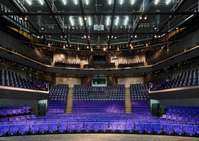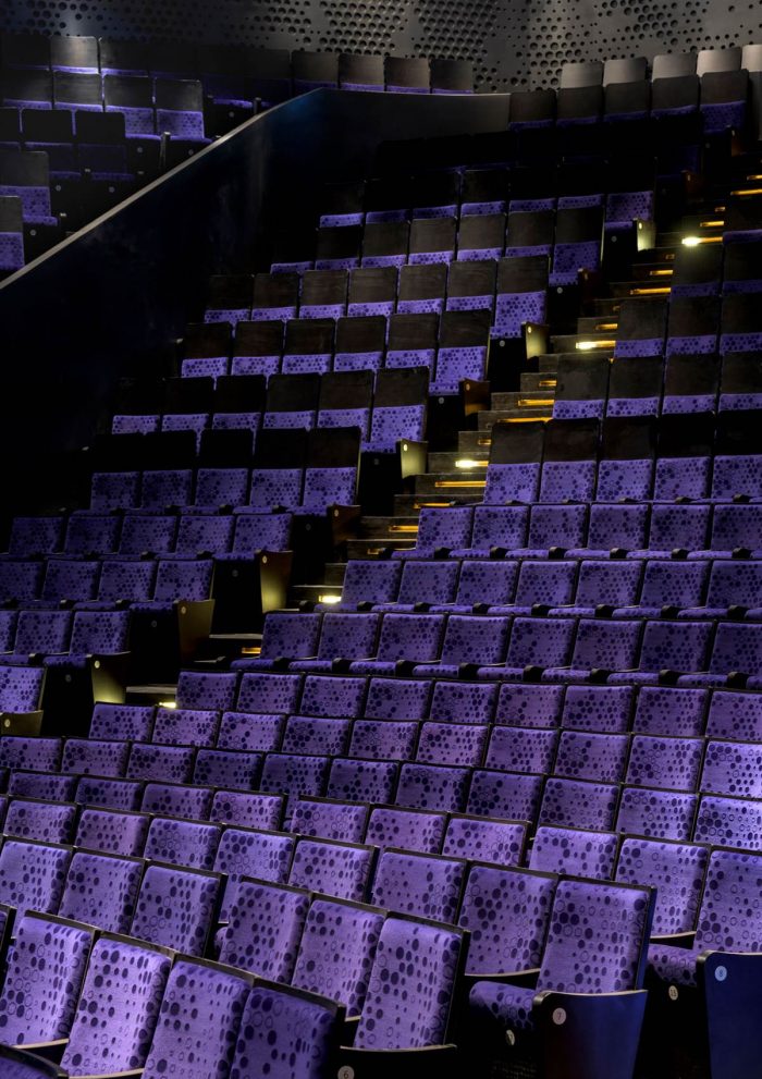 The Playhouse Theater for 1210 seats is designed for a wide variety of performances and dance performances, so flexibility is a key characteristic of the design of this multifunctional space. The location of the audience adapts to a specific show: viewers can sit in front of the stage or on three sides of it. Attention is drawn to the interior, made in gold and purple tones.