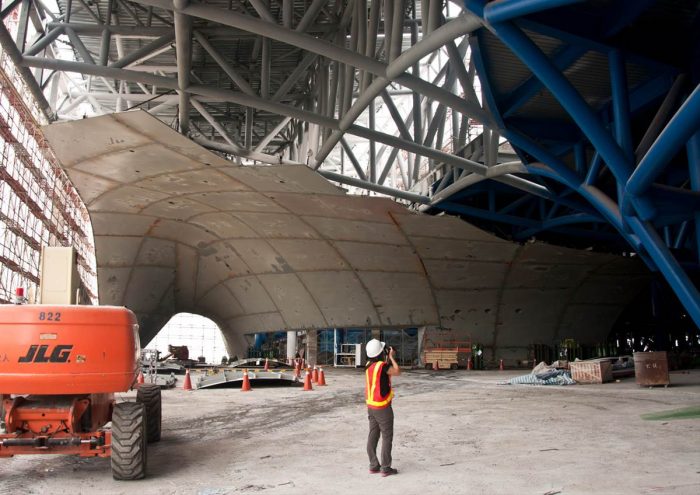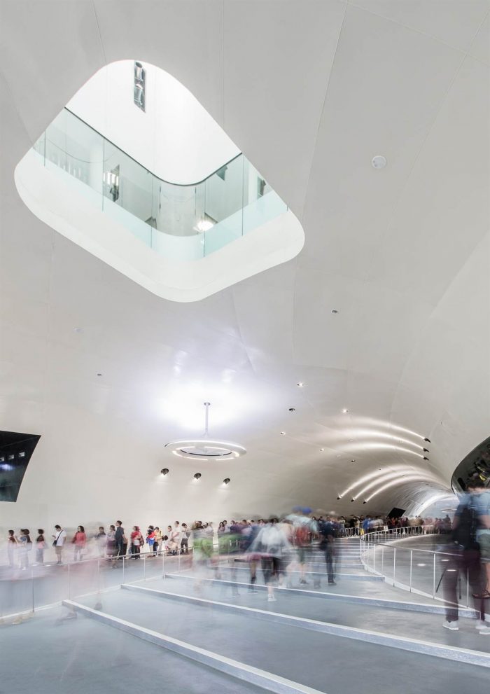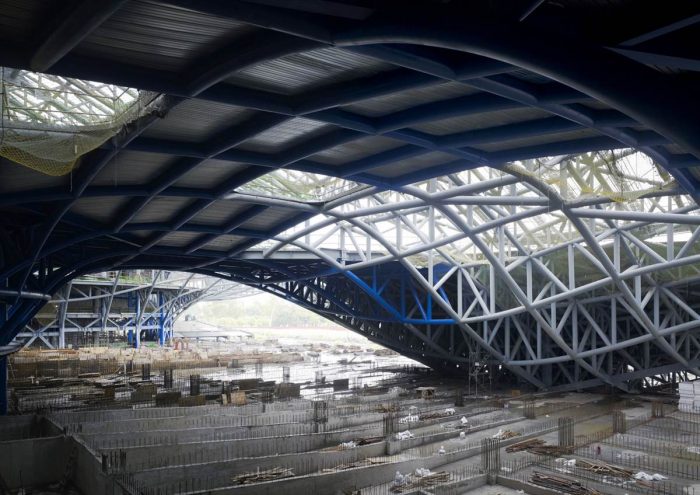 Curved steel construction was built in collaboration with local and Dutch shipbuilding companies. Under it are several concert halls and the public space of Banyan Plaza, which is created taking into account the subtropical climate and allows the wind to freely walk in the interior. Kaohsiung residents can stay there day and night, practice Tai Chi or yoga, have street performances along the walkways and in an informal setting, dance and hold movie evenings.