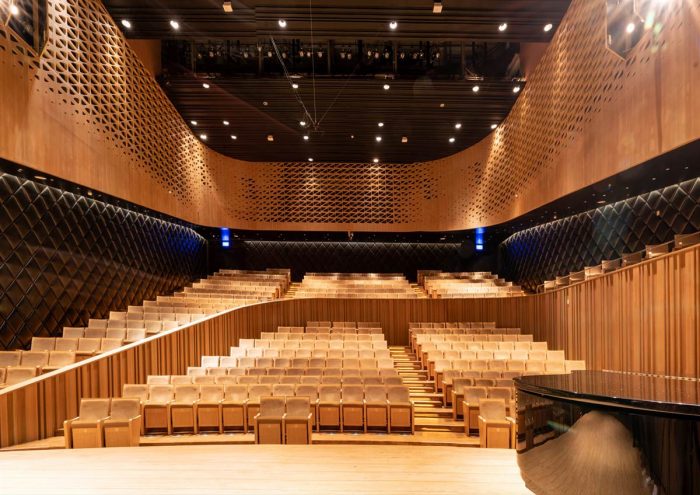 In the concert hall for solo and chamber performances (Recital Hall) for 434 seats created the most cozy atmosphere. With its asymmetrical layout and placement on two levels, it is great for performances involving a small number of people.
