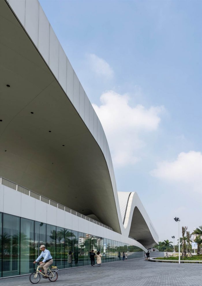 弯曲的钢结构与当地和荷兰的造船公司合作建造。在它下面是几个音乐厅和榕树广场的公共空间,它是在考虑到亚热带气候的情况下创造的,并允许风在内部自由穿行。高雄居民可以日夜呆在那里,练习太极或瑜伽,沿着人行道进行街头表演,在非正式场合,跳舞和举办电影之夜。