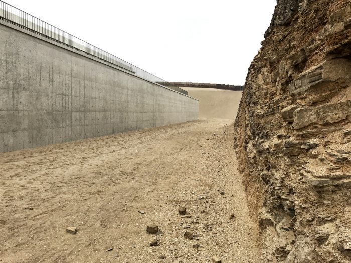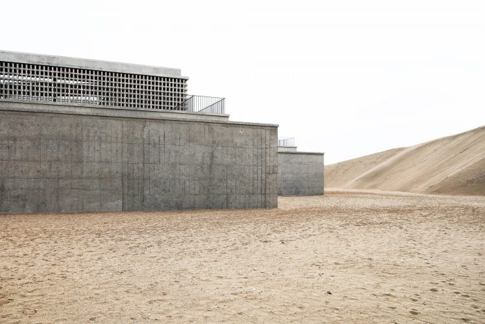 The intervention stabilizes and restores a degraded and vulnerable site by occupying a previously excavated area. This creates a public space between the Museum and the surrounding dunes without touching them or surpassing them in height.