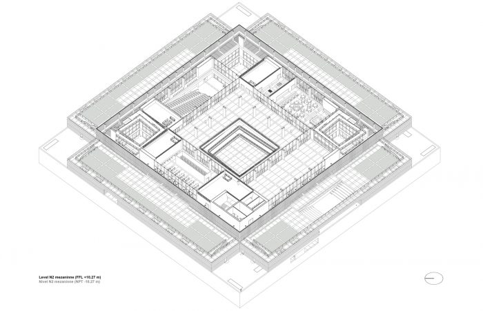 The vertical void is illuminated with zenithal light whose intensity is controlled by mechanical louvers allowing for different lighting conditions for the temporal exhibitions. The building´s structural flexibility is not only a characteristic of the exhibition spaces but of the laboratories and storage space as well; these spaces on the four sides of the building can be used as large spaces or divided into smaller rooms as the program of these activities is defined.