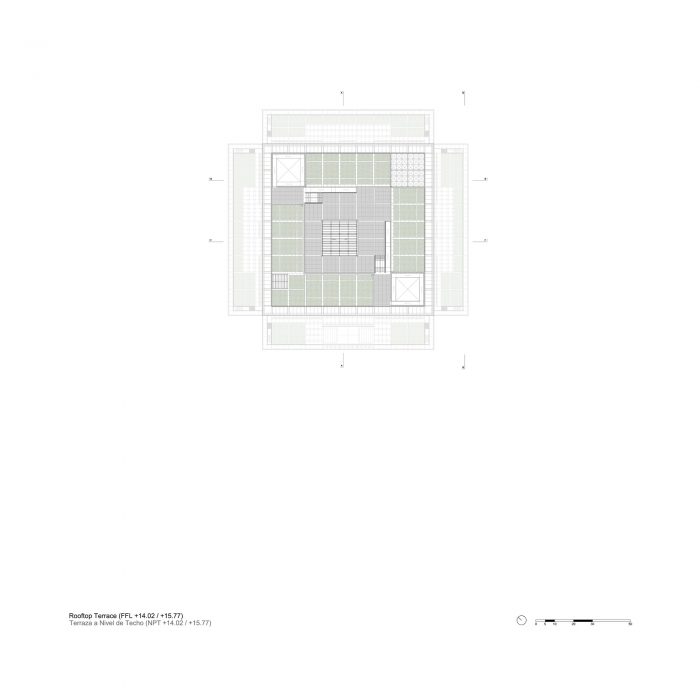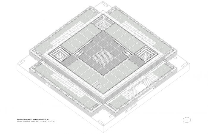 Performance. The new infrastructure limits the visual presence by building 70% of its program below ground: a decision that benefits the infrastructure with both seismic resistance (8 structural plates connected to a subterranean technical area) and thermodynamic stability. The overall thermodynamic proposal of the MUNA infrastructure is passive by implementing thick naturally insulated floor slabs (of earth and plants) on all exterior horizontal surfaces, and the placement of mobile concrete “adobes” for the wind and sun textile screen separated 4.5m from the insulated glass- areas for chance encounters that protect the public spaces on the second level and give access to the patios which simultaneously bring light underground and provide accessibility to the rooftop observatory.