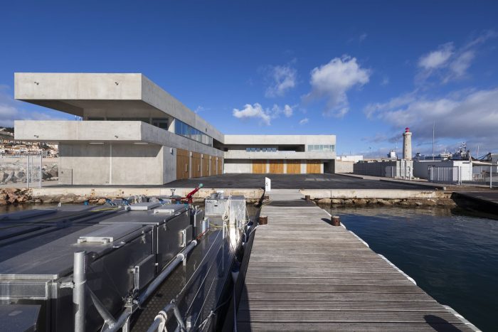 The nautical pole is located in an emblematic site at the end of the Saint Louis mole in the port of Sète. With multiple uses for associations, the Société Nautique de Sète (SNS) and the SNSM, it ensures the necessary functionality by grouping together nautical activities in its base to accommodate office and social spaces on the upper floor. By its positioning and its materiality, the project aims to blend into the landscape while revealing it. It is from the reception room, which opens onto a vast terrace, that the distant horizon is revealed.