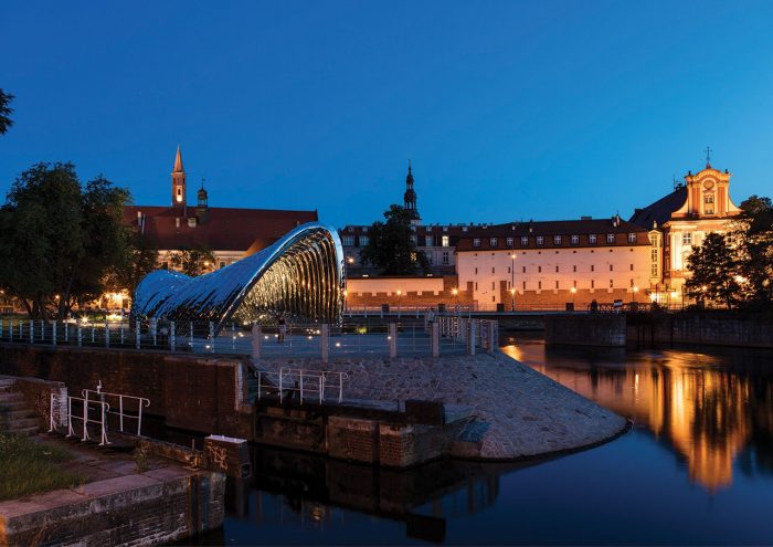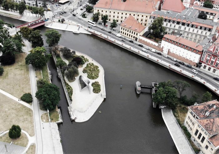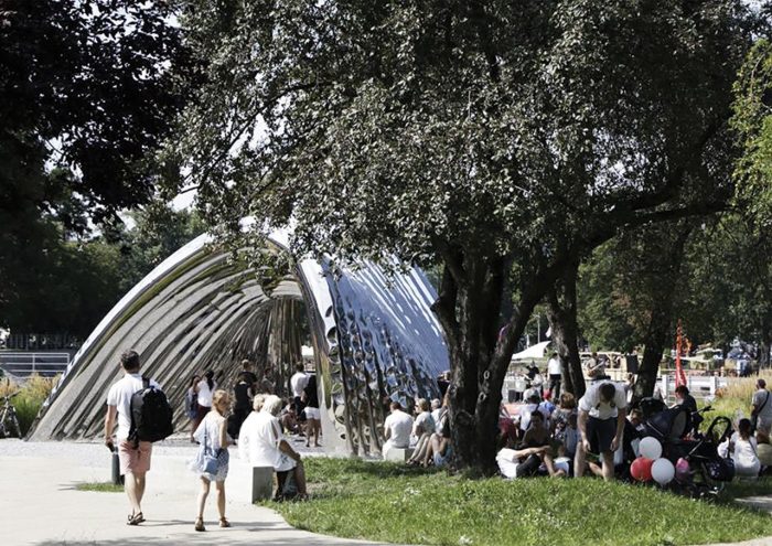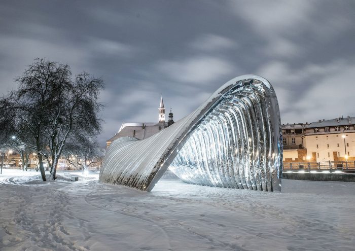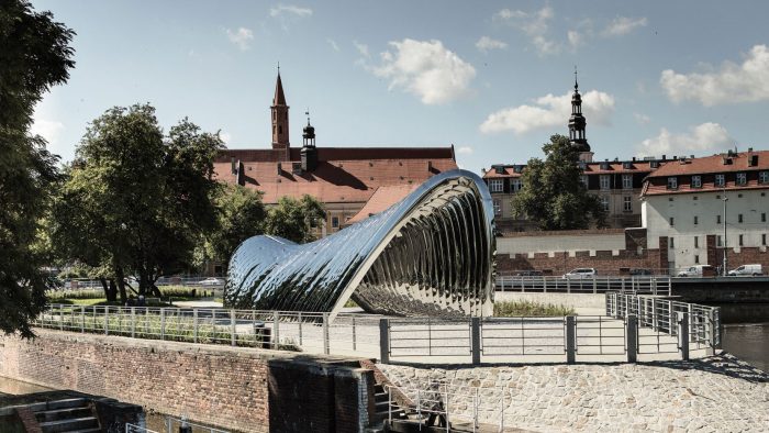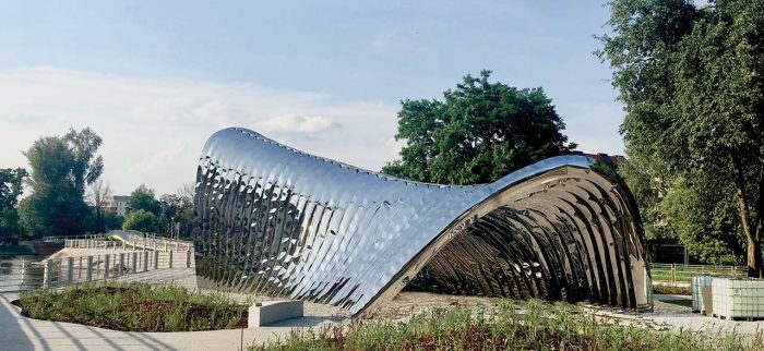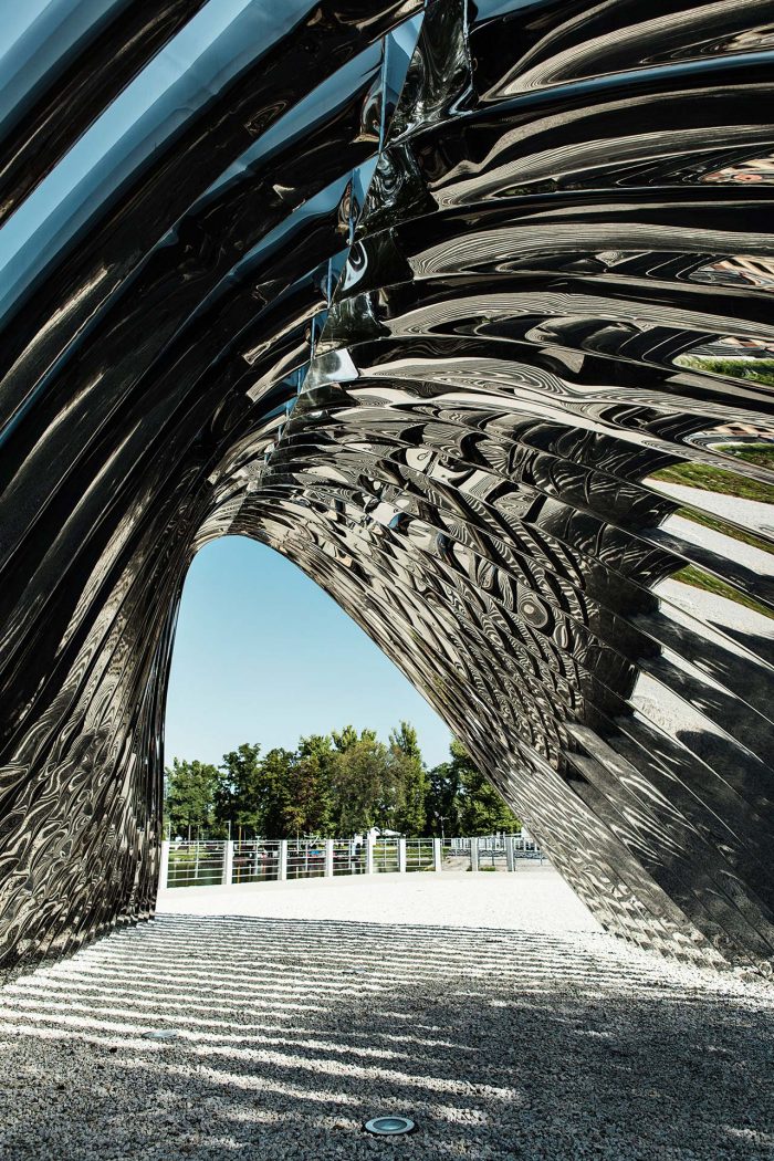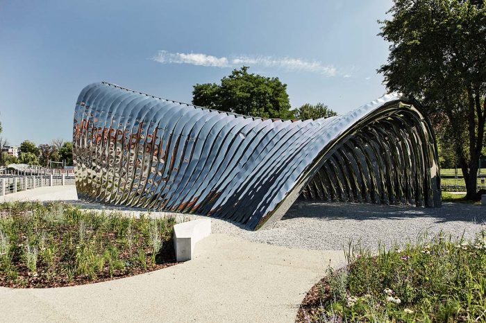 Located in Daliowa River Island, the smallest of over a dozen in downtown Wrocław in western Poland, NAWA is a futuristic architectural sculpture by Polish architect Oskar Zięta that reflects, both literally and figuratively, its historic surroundings. Organic in shape and mirror-polished in finish, the sculpture references the island’s shape while reflecting the lush natural landscape formed by the Oder River, while surreptitiously alluding to the city’s architectural history.Designed with the help of advance software and built using innovative technology invented by Zięta himself, the bionic installation is nevertheless inspired by the arched construction of some of the city’s most iconic Gothic and Baroque edifices, bridging Wrocław’s past and present through its innovative design.