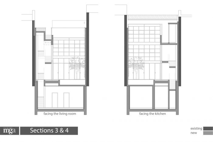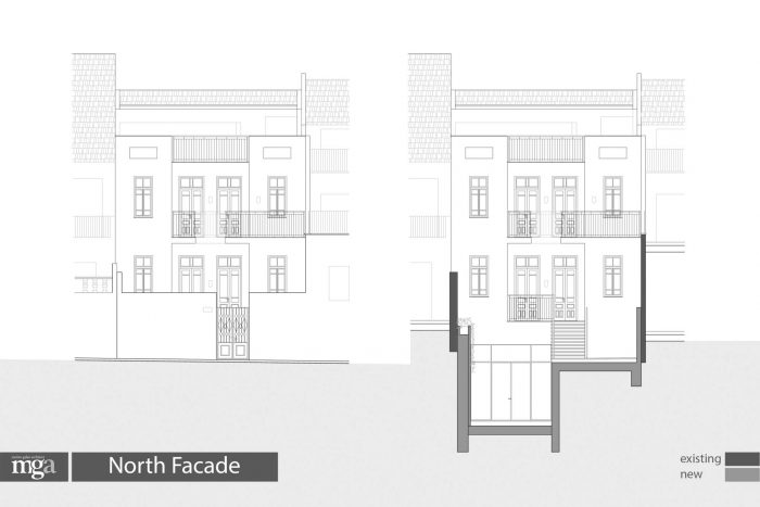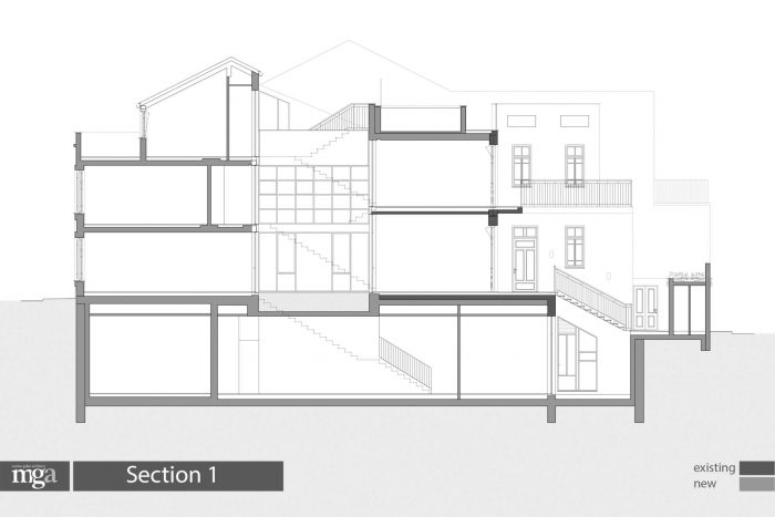 南翼被重建和扩展,包括两个新的楼层,由于保护高度的限制,比旧翼的楼层低,还有一个带阳台的瓦片屋顶阁楼。外墙虽然是新的,但其设计细节与原来的北面外墙相似。在旧翼和新翼之间设计了一个花园天井,作为房子的核心,提供额外的自然光,并在非常密集的城市结构中作为一个亲密的私人户外空间发挥作用。虽然街道的外墙保留了原有房屋和社区的美学特征,但天井的钢架窗外墙被设计成一个对比实体,强调了新的建筑设计。建筑师Meirav Galan说,这是 "这个奇妙的房子的旧故事中增加的新章节"。
