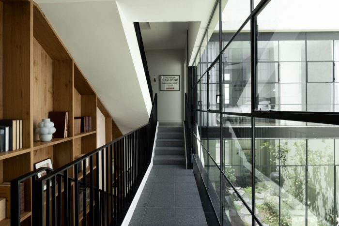 The southern wing was rebuilt and extended to include two new floors lower than the old wing floors due to preservation heights’ limitations, and a tiled roof attic with a balcony. The façade, though new, was designed with details similar to the original northern façade. A garden patio was designed as the heart of the house between the old wing and the new one, providing extra natural light and functioning as an intimate private outdoor space in the middle of a very dense urban fabric. While the street facades preserve the aesthetic character of the original house and of the neighborhood, the patio’s steel-framed windows facades were designed as a contrast entity, emphasizing the new architectural design. This describes Architect Meirav Galan, is “the new chapter added to the old story of this marvelous house”.