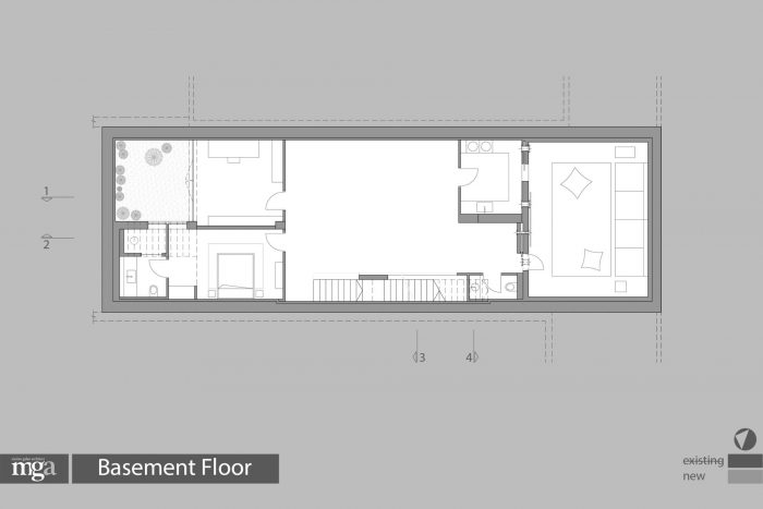 联排别墅的建筑设计,横跨一个长长的矩形地块(8.5米/28.5米),包括市政府法律要求的保护,部分破坏,以及新增加的建筑面积从250平方米扩展到580平方米,其中190平方米在地下(在支持现有房屋的保留部分和邻居的房屋的同时建造)。