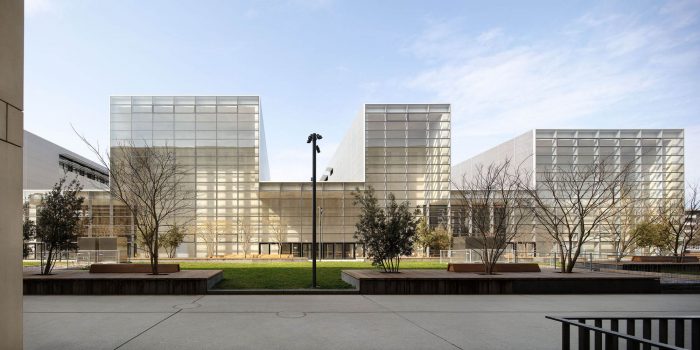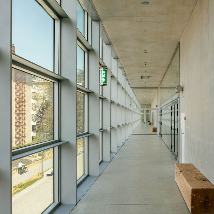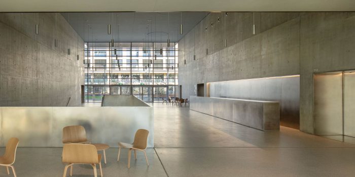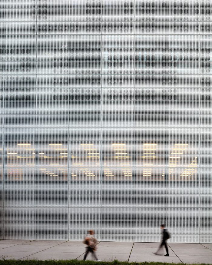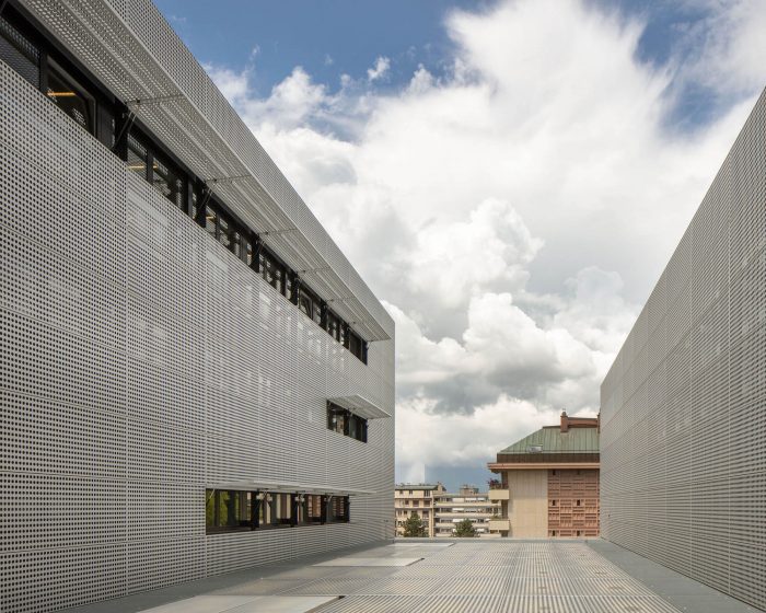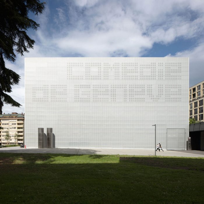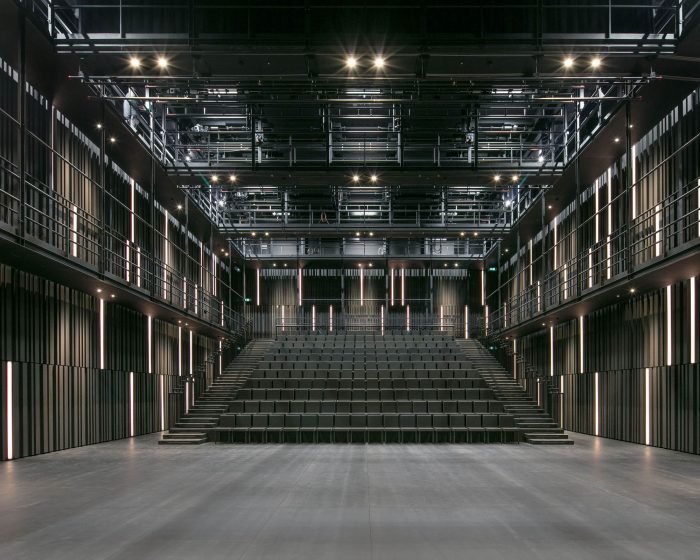 The modular black-box type hall is dedicated to experimentation. An elementary and neutral volume, with a modular bleacher system, allows multiple configurations to be set up. The walls are covered with fiber-reinforced concrete slats, the patterns of which guarantee excellent acoustics.