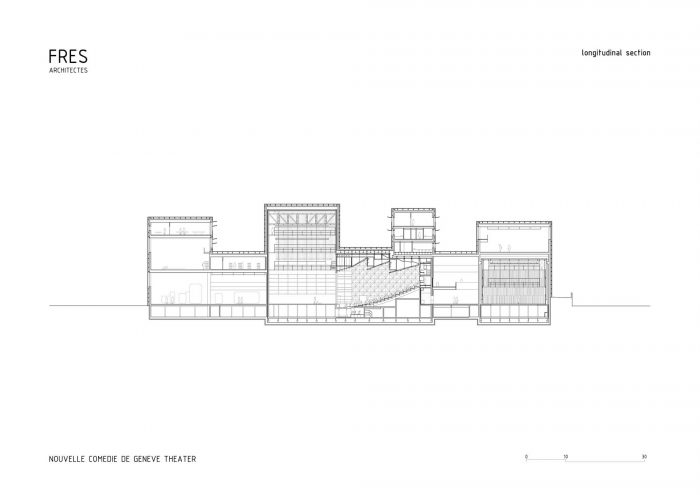 Where classical theatres distinguish the stage tower as the central element of the building's composition, the characteristic crenelated profile of the project expresses the multiplicity of activities taking place in the new theatre.