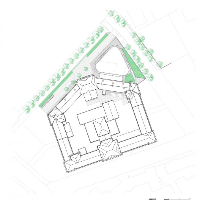 机翼重建区和新的演讲室VŠPJ(理工学院)是一个现代概念的快速发展的教育中心,位于该地段的东北角,原来被认为是一个农田。新建筑的位置是严格对称的,明显的三角形,因此对于建筑来说似乎是不利的。来自Qarta architektura工作室的作者们通过利用这个形状将劣势变为优势,并通过与现有街区的连接,为大跨度建筑获得了紧凑的空间。