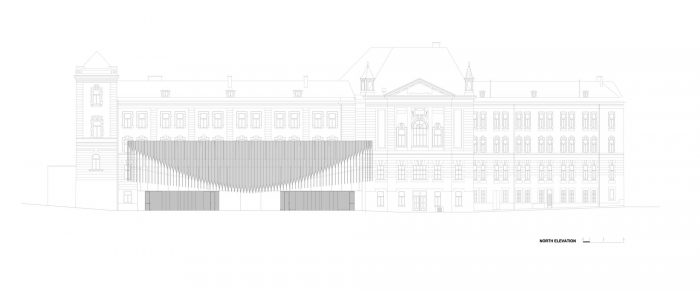The roundness of the corner contributes to the integration of a mass into a complex context; the offset façade is another trace of a new shape, creating a transition space. Inside a super elevated hall is amphitheatrical seating for 333 students. Thanks to the steepness of the stands the arena offers excellent visibility as well as pure acoustics. Tribunes have underpass, the space under them will be used for social events. Connecting the presentation hall leads to a classical element of higher education “alchemistic workshop”, represented today by the multimedia laboratory “virtual factory”.