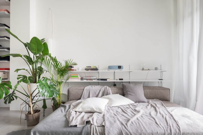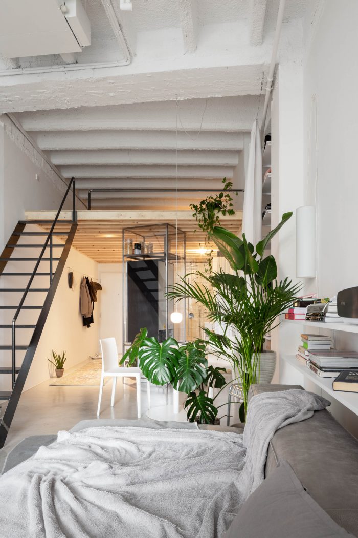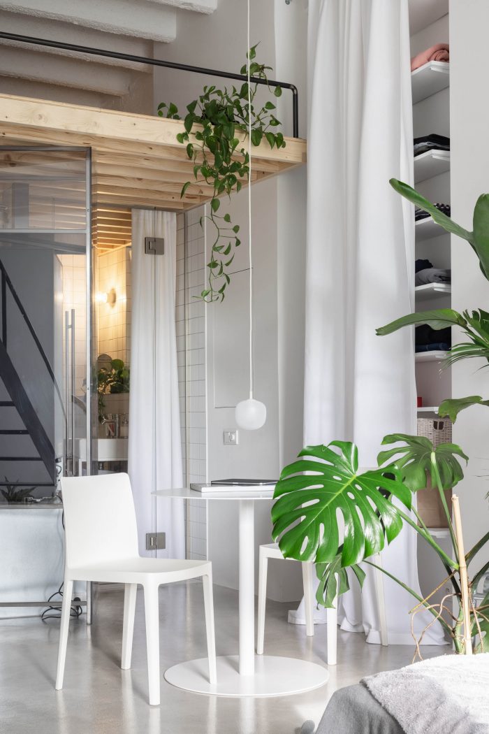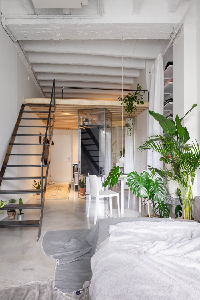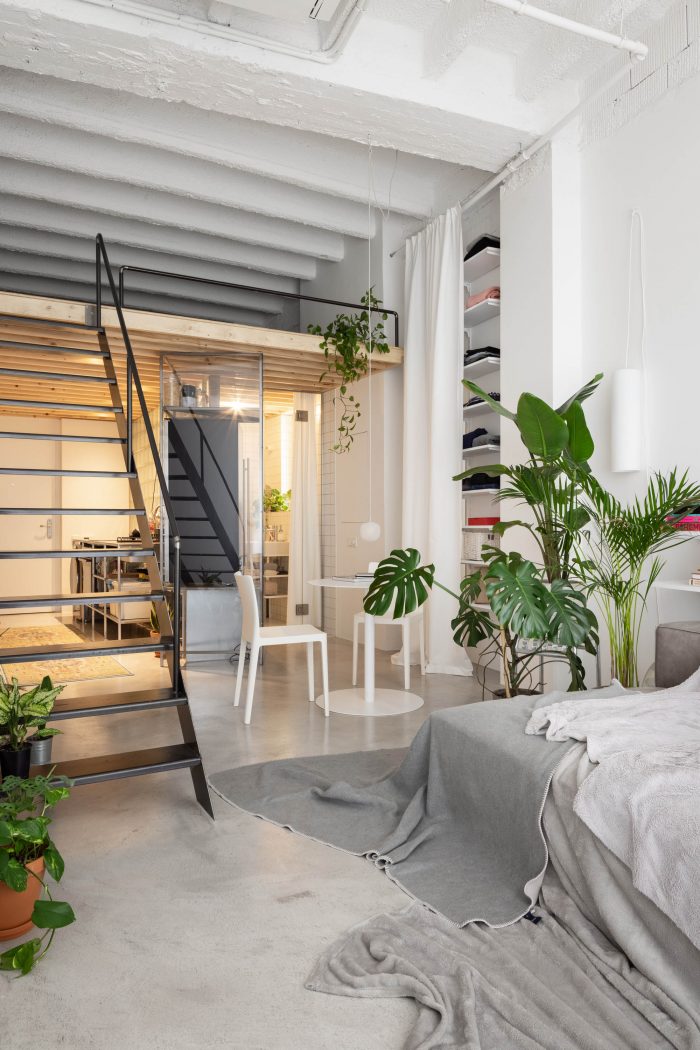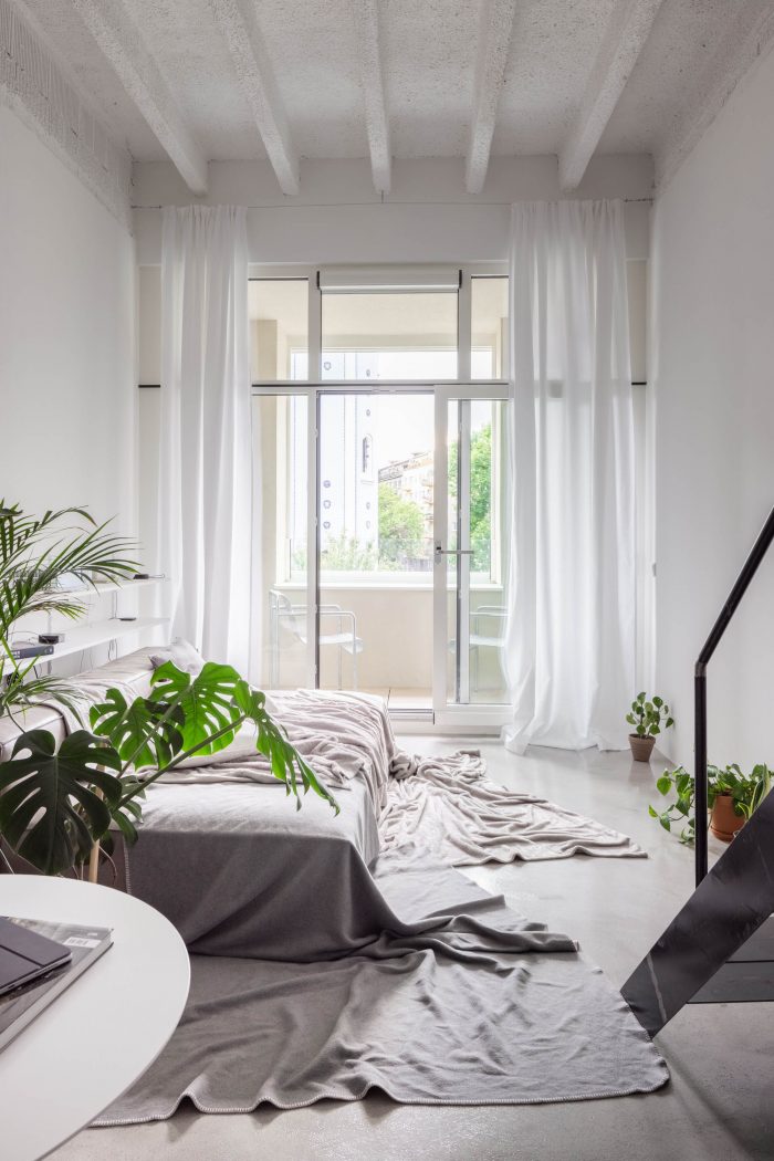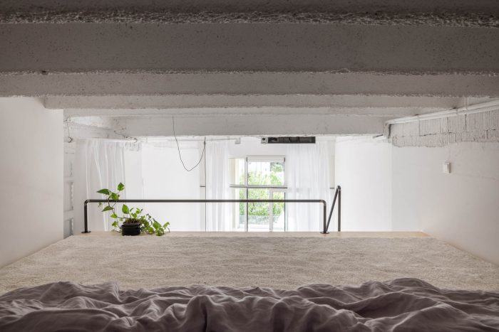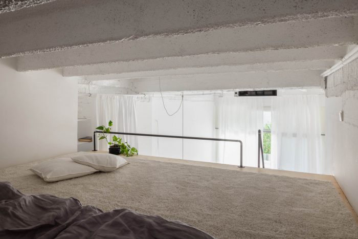 这套公寓只配备了最基本的物品,比例宽松。有一个1.2米深的日间床,而不是传统的沙发,宽大的白墙被用作投影屏幕,而不是容纳一个大电视。在上层,有一个睡眠区,一组放衣服的架子,和一个用于日常休闲的大地毯。