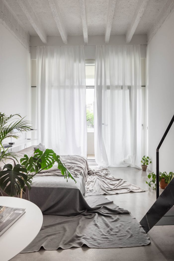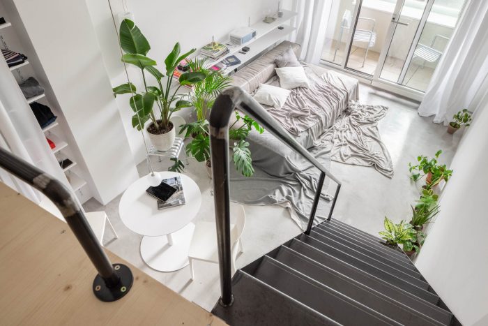 The apartment is equipped only with the most essential objects with generous proportions. There is a 1.2-meter-deep daybed instead of a traditional sofa, the generous white walls are used as projection screens instead of holding a big TV. On the upper floor, there is a sleeping area, a set of shelves for clothes, and a large rug for daily lounging.