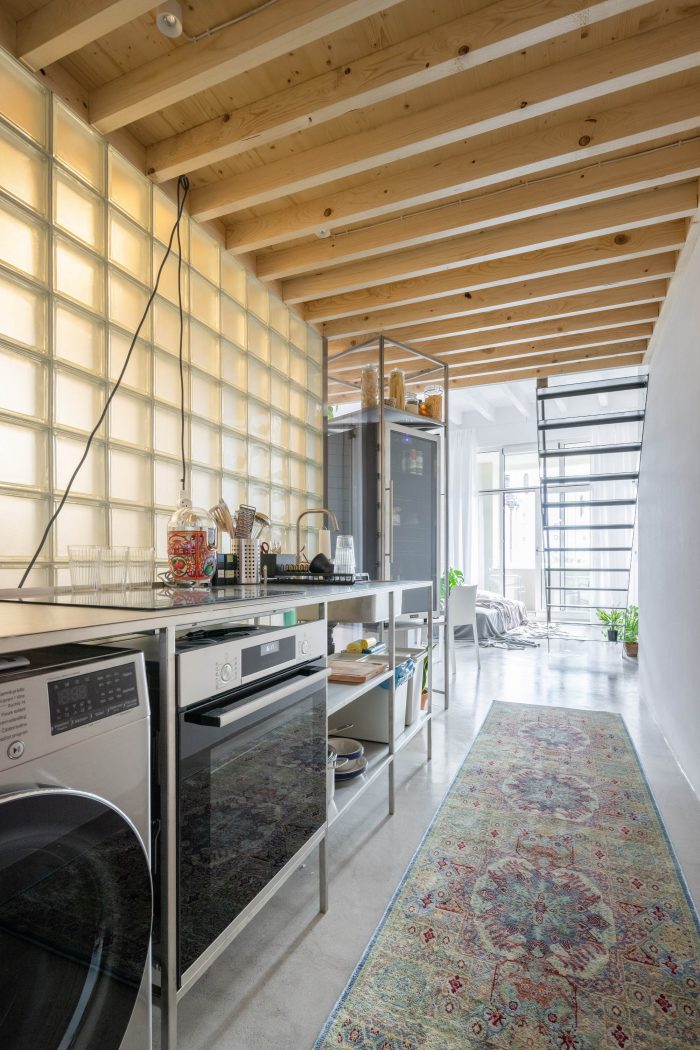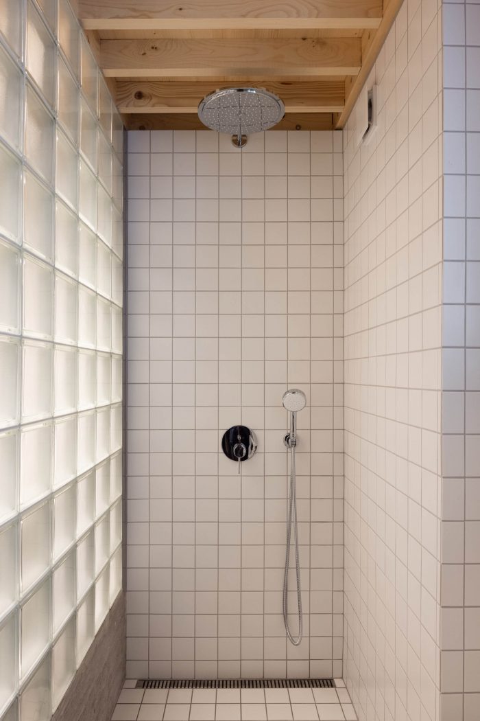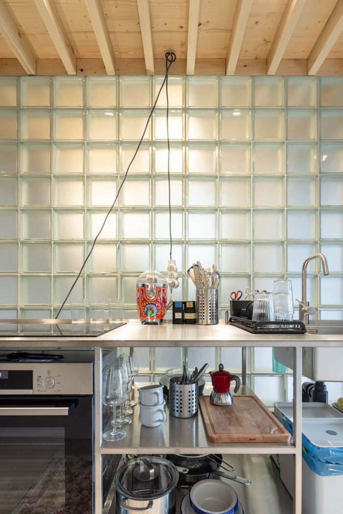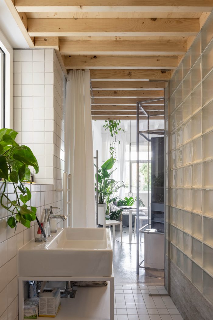 The inserted floor expanded the floor area by about additional 15 square meters. By using a wall from translucent glass blocks between the bathroom and the new kitchen, we brought daylight into the kitchen area, so that space appears optically larger. The same wall separates the bathroom zone with a shower on the opposite side.