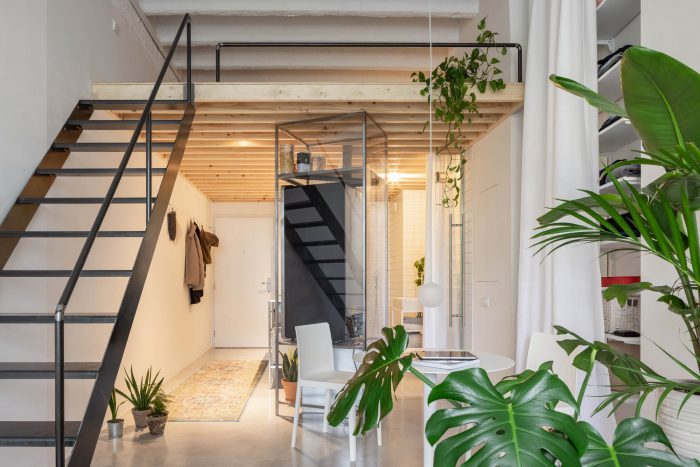 因此,材料主要是透明的和功能性的。我们让开放的空间以其高高的天花板脱颖而出。原来的标准布局提供了一个独立的浴室,一个降低的石膏板天花板,所有可能隐藏的线路和技术,以及一个靠墙的厨房,背对着蓝色教堂的景色。通过拆除天花板,重组技术基础设施,并插入一个夹层地板,这个工作室成为一个成熟的公寓,有一个独立的夜间区域和一个舒适的楼梯。