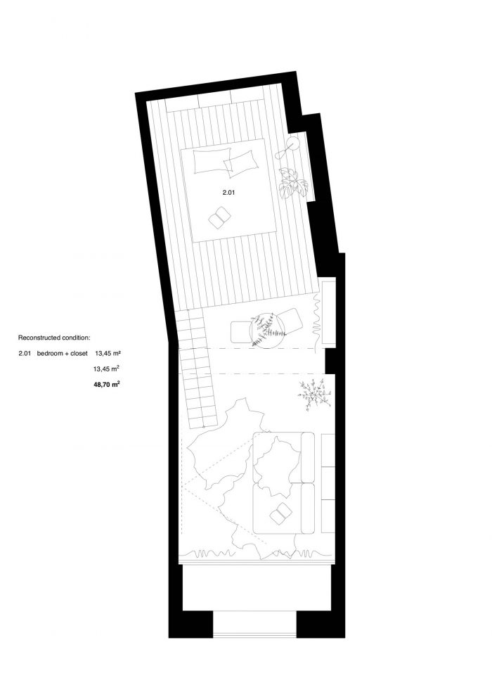 The apartment Next to The Blue Church is a kind of weekend loft close to the historical center of Bratislava. In its original state, it was rather a larger and rigid "cell" with hidden potential and a beautiful view of the Art Nouveau monument called “The Blue Church”. We were not looking for a design or a careful and meticulous craft for this apartment, it was not important for us, because it would not give you that experience of well-being. For us, it was mainly about views, openings, atmospheres, location, the play of light and shadow.