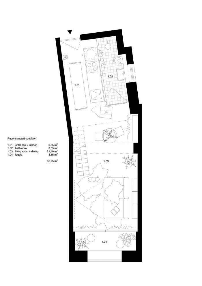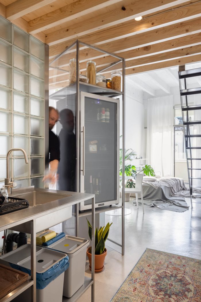 Therefore, the materials are largely transparent and functional. We let the open space stand out with its high ceilings. The original standard layout offered a separate bathroom, a lowered plasterboard ceiling with all possible hidden wiring and technology, and a kitchen leaning against the wall turned with its back towards the view of the Blue Church. By removing the ceiling, reorganizing the technological infrastructure, and inserting a mezzanine floor, this studio became a full-fledged apartment with a separate night zone and a comfortable staircase.
